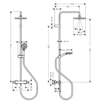 -La douche de tête a un diamètre de 205mm et offre un jet Rain avec un débit de 8,7 l/min sous 3 bars de pression. La douchette propose quant à elle des jets Rain et IntenseRain avec le même débit